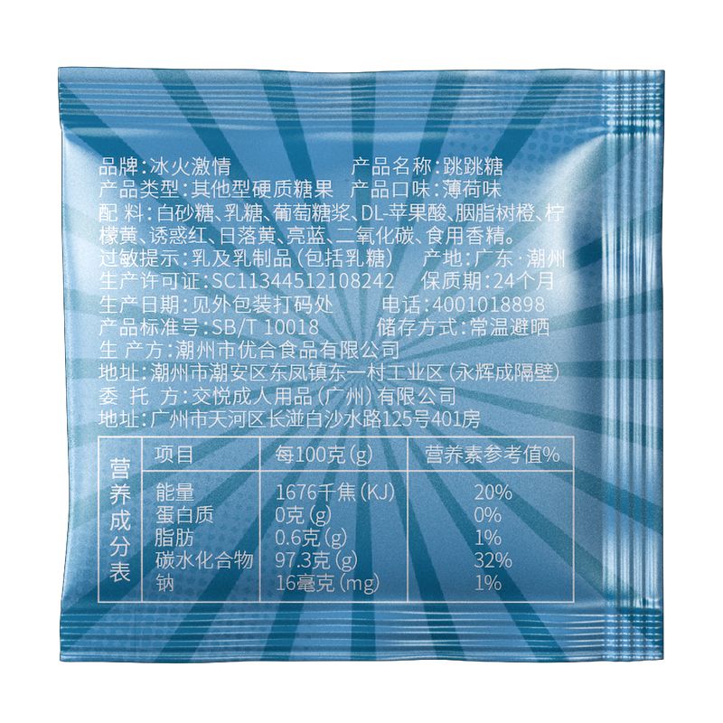 配 料 :白砂糖、乳糖、葡萄糖浆、DL-苹果酸、胭脂树橙、柠 檬黄、诱惑红、日落黄、亮蓝、二氧化碳、食用香精。